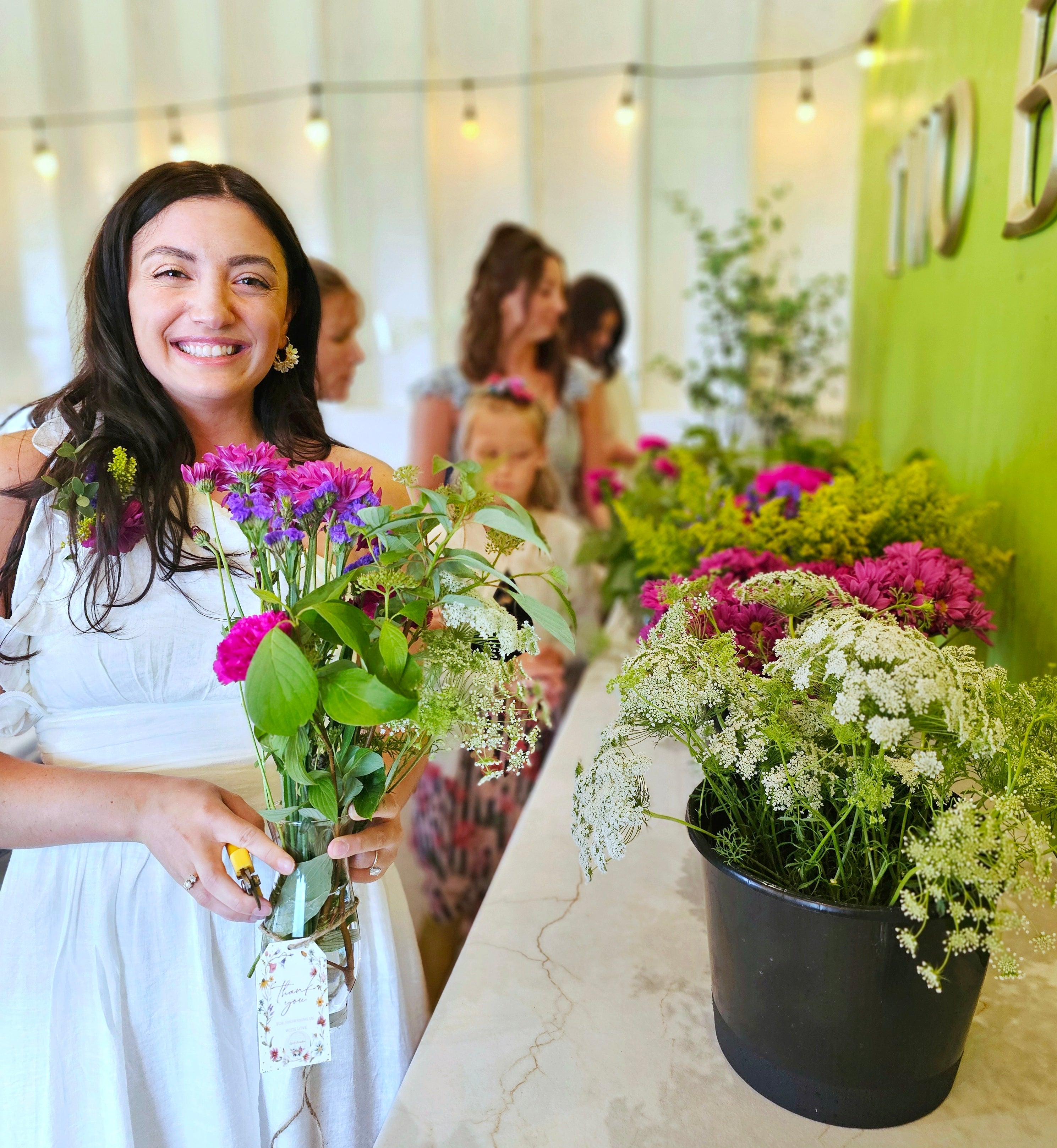 Each guest picks their own flowers from the buckets provided and creates their own bouquet to take home.